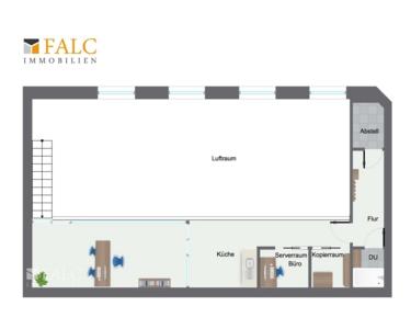 Das Erdgeschoss bietet neben dem großzügigen Loftbereich einen Flur, zwei Sanitäranlagen (eine davon barrierefrei) sowie eine Dusche. Darüber hinaus befindet sich auf der Empore eine Glaskabine, die sich ideal als Besprechungsraum eignet, sowie eine Teeküche. Ergänzt wird das Raumangebot durch einen Gang, der zu einem Serverraum, einem Kopierraum, einem Abstellraum mit Waschmaschinenanschluss und einer weiteren Dusche führt.