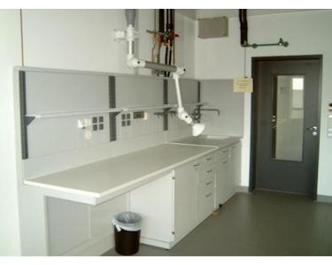 Bei chemischen Laboren zusätzlich Laborabzug, Chemikalien-Sicherheitsschrank, Säuren- und Laugenschrank