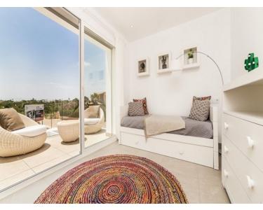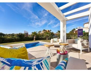 Die Einfamilienhäuser der Wohnsiedlung Las Villas de Dalt de Sa Rápita im modernen, minimalistischen Design, mit großzügigen, lichtdurchfluteten Räumlichkeiten bieten optimale Flächennutzung und maximalen Komfort.