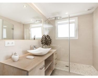 Bodengleiche Duschtasse, wie Bodenbelag der Bäder. Aufsatzwaschbecken