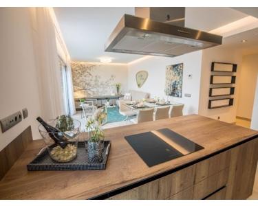 - Separate Küche in den 2 Schlafzimmer- und Duplex-Penthäusern in Phase 1, getrennt durch einen massive Glaswand und eine verglaste Schiebetür.