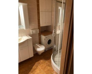 hochwertigen Einbaugeräten, Bad mit Dusche und Waschmaschine gefliest