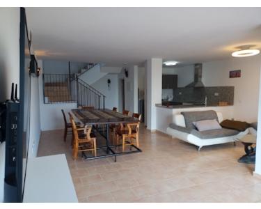 Erdgeschoss mit voll ausgestatteter Küche, Tisch mit 8 Stühlen, Schlafcouch, Fernseher, Gartenmöbel.