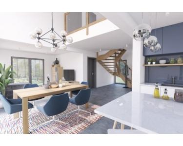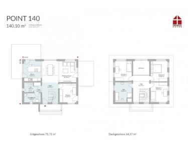 Das Point 140 - Zwei architektonische Highlights heben dieses Haus aus der Masse heraus. Das sind die moderne Hauseingangsüberdachung mit Flachdach auf der einen und die fast traufhohe Verglasung auf der anderen Seite. Mit dem hohen Luftraum über dem Essplatz und der Galerie im Obergeschoss bringt das Riesenfenster ein unglaublisches Raumerlebnis.Der luftige Grundriss im Erdgeschoss erfährt damit eine neue Dimension. Mit 3 Schlafzimmern im OG und einem zusätzlichen Raum auf der unteren Ebene ist auch für die Familienplanung ,, Luft nach oben".
