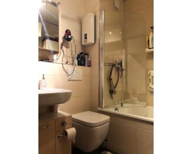 Von der Diele der Wohnung geradeaus auf der linken Seite befindet sich das renovierte Badezimmer mit Wanne.