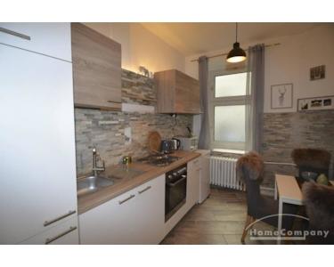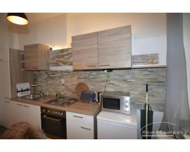 Die zentral und doch sehr ruhig im Gartenhaus gelegene Wohnung wurde größtenteils frisch renoviert und ist gemütlichen und zugleich modern. Man betritt die Wohnung durch einen kleinen Flur. Links befindet sich eine sehr gemütliche, durch die Steinoptik urig anmutende Wohnküche, in der man essen und gemütlich verweilen kann. Es gibt einen Esstisch, einen Kühlschrank, einen separaten Gefrierschrank, Herd, Backofen mit sämtlichen Funktionen, Mikrowelle und die wichtigsten elektronische Geräte.