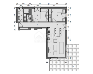 Die Wohnung befindet sich im Erdgeschoss und hat eine Gesamtwohnfläche von 100,56 m2. Sie besteht aus einer Eingangshalle, einem mit Küche und Esszimmer verbundenen Wohnzimmer, zwei Schlafzimmern, Bad, WC und einer nicht überdachten Terrasse von 32,85 m2.