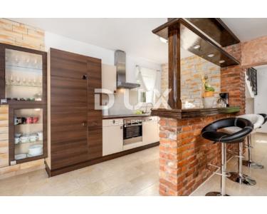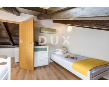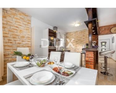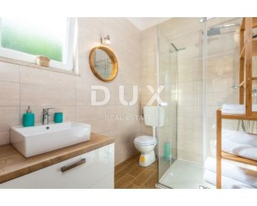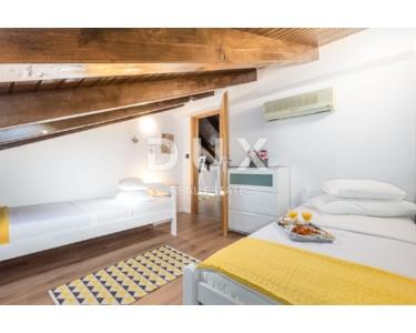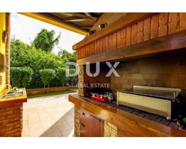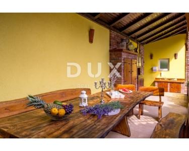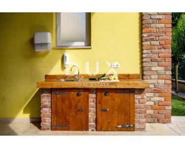 Auf der gleichen Etage gibt es eine Kinderecke, ein schönes Spielzimmer für Kinder, eine gepflegte Liegewiese mit Rutsche und Schaukeln. Im Erdgeschoss befindet sich eine Zwei-Zimmer-Wohnung mit einem größeren luxuriösen Wohnbereich und Zugang zu einer großzügigen überdachten Terrasse mit Essbereich, Küche und Bad. Die Wohnung nimmt eine Fläche von 145m2 ein. Im 1. und 2. Stock befindet sich eine große Maisonette-Wohnung, organisiert als Vierzimmerwohnung mit einem großen Wohnbereich, mit einer Küche mit Essbereich und zwei Badezimmern und zwei Terrassen. Die Wohnung nimmt eine Fläche von 290 m2 ein. Die Wohnungen sind möbliert, dekoriert mit Geschmack und Stil. Die Wohnungen verfügen über eine zentrale Gaszentralheizung, schöne Kamine (3), einer pro Etage und eine Klimaanlage in der Funktion Heizen/Kühlen. Die Küchen sind neu mit allen Geräten und Geräten und werden als solche wenig benutzt. Die Apartments sind mit Brač-Stein und istrischem Kanfanar, erstklassiger Keramik (ausschließlich an den Badezimmerwänden), hochwertiger Sanitärkeramik, Eichenboden, Designerbeleuchtung und moderner rustikaler Außen- und Innenschreinerei bereichert. Innenräume von Fußböden, Bars, Bänken komplett aus Stein. Freistehend auf einem eingezäunten, gepflegten Garten bietet es Ruhe und Intimität von der Nachbarschaft. Kultivierte Umgebung (Rosmarin, Lavendel), gepflasterte Terrassen, Parkplätze, schmiedeeiserne Zäune und bepflanztes Grün, Lorbeer, Kirsche, Kiefer, Zypresse und andere Pflanzen machen dieses schöne Haus zu einem perfekten Ganzen. Auf dem Grundstück wurde ein freistehendes Gästehaus von 112 m2 gebaut, und vom Hof aus gibt es eine Kommunikation / Passage für alle Teile des Hauses sowie einen Ausgang zum eingezäunten gepflegten Landschaftsgarten.