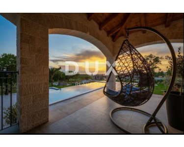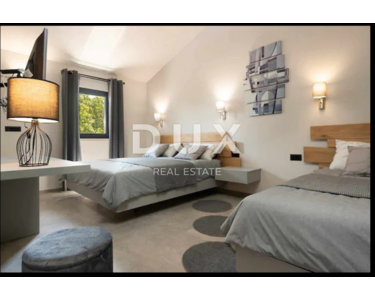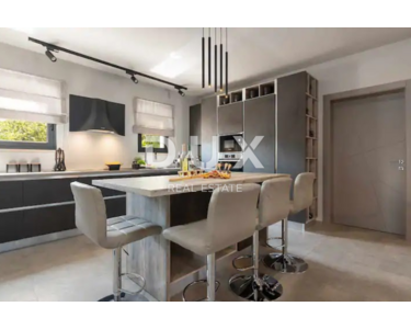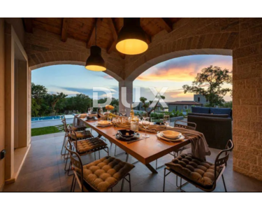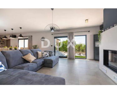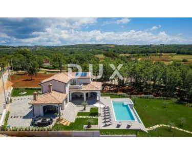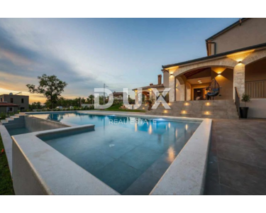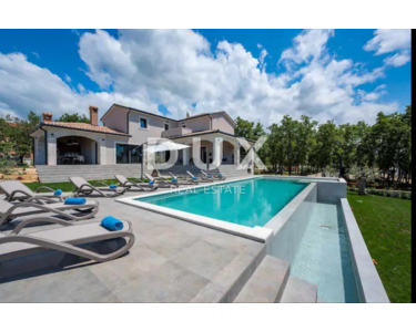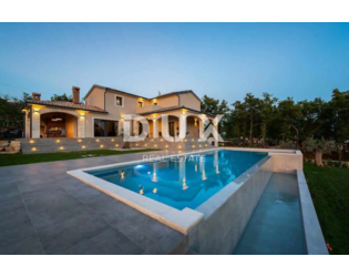 Nicht weit von Vižinada entfernt befindet sich diese luxuriöse, moderne und rustikale Villa, die 2020 erbaut wurde und sich auf einem privaten Grundstück von 1600 Quadratmetern mit wunderschönem Panoramablick auf das Meer befindet. Die Villa liegt an einem ruhigen Ort, umgeben von Wäldern und Feldern. In der Nähe befinden sich zwei weitere Ferienhäuser. Das nächste Geschäft ist ca. 3 km entfernt, die Wein- und Olivenölstraße ist nur 500 m vom Haus entfernt und das Meer ca. 15 km. Auf einem großen, vollständig eingezäunten Grundstück bietet die Villa einen 54 m2 großen Infinity-Pool, eine Sommerküche mit Grillkamin und Esstisch, eine Sitzecke, einen Badminton-/Volleyballplatz, ein Trampolin und Schaukeln für die Kleinen. Ferienhaus für 9 Personen von 280 m2 erstreckt sich über zwei vollklimatisierte Etagen. Im Erdgeschoss befinden sich ein geräumiges Wohnzimmer mit voll ausgestatteter Küche, Esstisch und Sitzecke, Doppelzimmer mit SAT-TV und eigener Dusche/WC sowie eine weitere Dusche/WC. Im ersten Stock befinden sich insgesamt drei Schlafzimmer mit jeweils eigener Dusche/WC, Klimaanlage und SAT-TV, zwei davon mit Doppelbett und eines mit einem Doppelbett und einem Einzelbett. Die Villa hat auch einen Keller mit einer Fläche von 350 m2. Diese schöne Villa ist eine tolle Einkaufsmöglichkeit für alle Liebhaber der Ruhe, die ihre Privatsphäre wünschen.