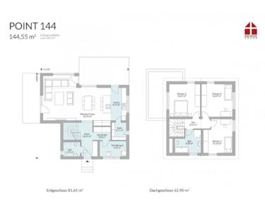 Das Point 144 mit Terrassen - Möglichkeit gehört zu den beliebtesten Häusern unserer Kunden. Es bietet eine perfekte Aufteilung im EG - mit geräumiger Küche, großem Essplatz, gut geschnittenem Wohnzimmer und viel Platz in der Diele. Die Speisekammer ist genauso praktisch wie die Option, im Gäste WC eine Dusche einzubauen. Und ein Gästezimmer ist nie zu verachten. Überraschend viel Platz bieten die Kinderzimmer im OG. Eine interessante Aufteilung der Funktionszonen zeigt das Familienbad.
