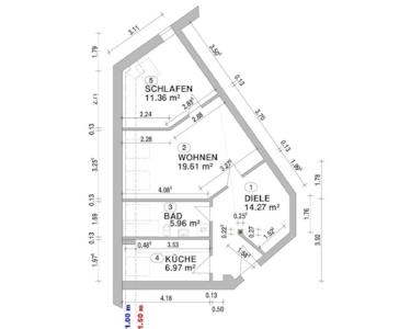 Die 2-Zimmerwohnung verfügt über eine Gesamtwohnfläche von ca. 58 m². Zugang zum Schlafzimmer erfolgt über das Wohnzimmer. Zugehörig zur Wohnung ist ebenfalls ein privater Kellerabteil. Das Tageslichbad mit einer Badewanne verfügt zudem über den Anschluss der Waschmaschine. Die Wohnräume sind mit Laminat- und Linoleumboden ausgestattet. Die Sanitärräume sind gefliest. Im Allgemeinen befindet sich die Wohneinheit in einem gepflegten Zustand. Die offen liegenden Holzbalken geben der Wohnung noch einen individuellen und einzigartigen Charakter.