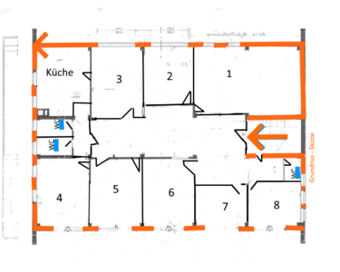Die Aufteilung der Etage wurde seinerzeit dem Bedarf des Mieters in Leichtbauweise angepasst viele Wände könnten daher auch nach Ihren Erfordernissen entfernt oder versetzt werden.