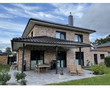 ca 10 qm überdachte Terrasse für laue Sommerabende. Hier wurden Keramikfliesen im Betonlook in Drainagemörtel verlegt.