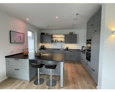 Moderne graue Landhausküche (Fa Schüller) mit schwarzen Applikationen und Granitarbeitsplatte. Die Einbaugeräte sind von der Firma Miele und Neff