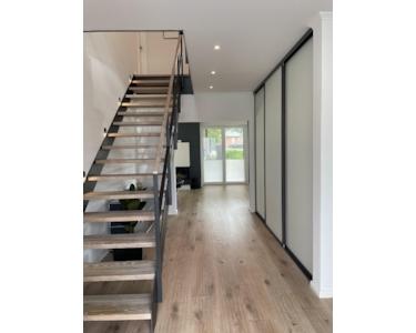 In der Diele harmoniert das Design vom Einbauschrank mit der anthrazitfarbenen Stahltreppe. Die Schiebetüren wurden passend zur Stahltreppe mit anthrzitfarbenen Stahlrahmen und Milchglas angefertigt