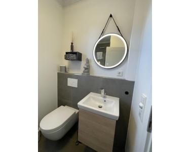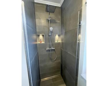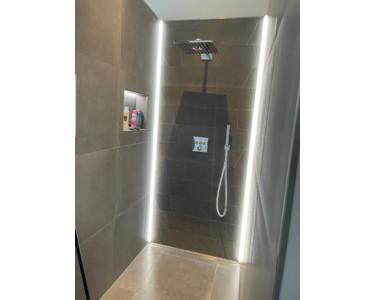Das Masterbad hat eine extra großer Walk-In Dusche mit LED Streifenbeleuchtungselementen, in der Wand integrierte Ablagefächer und Ablaufrinne. Im weiß verputzen Ablageregal ist ein Wäscheabwurfschacht integriert.