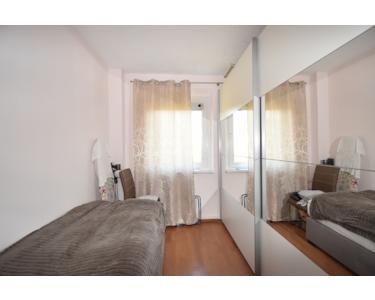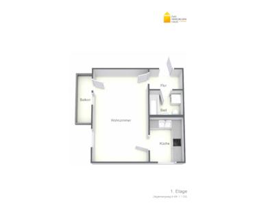 Aufteilung: Flur, Bad, Wohn- und Schlafbereich mit Zugang zum Balkon, Küche