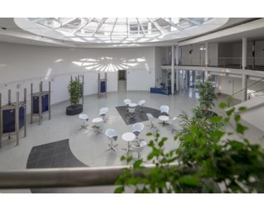 Das 6-geschossige Bürogebäude verfügt über vier Eingänge und zwei Treppenhäuser. Der Haupteingang ist durch einen repräsentativen Veranstaltungs- und Vortragssaal mit Raumakustik und großer Leinwand geprägt.