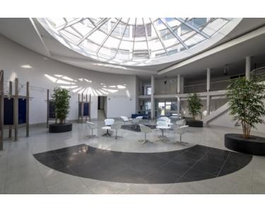 Das 6-geschossige Bürogebäude verfügt über vier Eingänge und zwei Treppenhäuser. Der Haupteingang ist durch einen repräsentativen Veranstaltungs- und Vortragssaal mit Raumakustik und großer Leinwand geprägt.