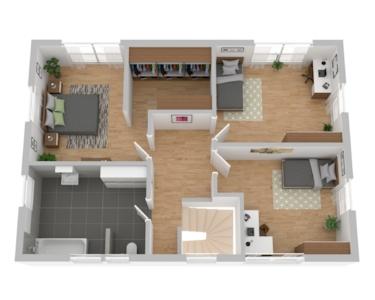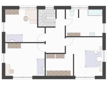 In diesem Haus genießen Sie einen Komfort, den Ihnen für gewöhnlich nur ein größeres Haus bieten kann. Viel Platz und genügend Stauraum für die Familie. Von der Haustür bis unter den Dachfirst ist dies ein Haus für die junge Familie. Die Gestaltung des Erdgeschosses bietet Ihnen die Möglichkeit eines gemeinschaftlichen Zusammenlebens. Platz für einen großen Esstisch und das Familiensofa sorgen dafür, dass Sie hier viele Aktivitäten mit der Familie gestalten können. Auch an Tagen die nicht zum rausgehen einladen. Die Küche ist groß genug um einen Frühstückstisch aufzustellen oder an Weihnachten als Backstube zu dienen. Kinder freuen sich über die 3 identischen Zimmer im Obergeschoss, denn so kann es keinen Streit geben. Auch das Schlafzimmer verfügt über genügend Stellfläche für ein Bett und Schränke. Und das Beste: Sie können daran auch etwas ändern. Gerne Planen wir mit Ihnen alle Ihre Vorstellungen und Wünsche in ein individuelles Bauvorhaben ein. Ob Ihr Haus größer oder kleiner werden soll, eine Dusche im Gäste-WC braucht, wir helfen Ihnen dabei Ihren Traum vom perfekten Eigenheim zu realisieren. Damit Ihr Haus genau so individuell wird wie Sie, der Bauherr! Ein weiterer Vorteil des Hauses ist sein Preis/Leistungsverhältnis, welches gerade jungen Familien genügend Spielraum bietet in Kombination mit der modernen Bauart die schon ab dem Einzug beim Sparen von Energie hilft.Dieses wird in diesem FIBAV Markenhaus durch denn Einsatz einer Vaillant LWWP der neusten Generation - sehr leiser Betrieb - inklusive Fußbodenheizung unterstützt.!! So sind Sie gut für die Zukunft gerüstet und sparen dort, wo man nicht am falschen Ende spart. Den Grundriss zu Ihrem neuen Traumhaus planen Sie innerhalb der Familie und wir erwecken diesen in der Bauphase für Sie zum Leben.