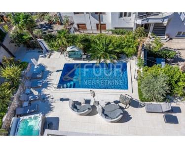 Wenn Sie die Treppe hinunter in den grünen Innenhof gehen, der mit üppigem Grün und Brac-Stein geschmückt ist, finden Sie einen beheizten 4 x 8 m großen Swimmingpool, einen Whirlpool für sechs Personen und einen speziellen Saunabereich sowie ein Außenbad und eine Solardusche. Der Außenwohnbereich der Villa lädt Sie ein, auf bequemen Liegen die Sonne zu genießen oder schöne Abende mit Familie und Freunden zu verbringen, komplett mit Außenküche und Grill.