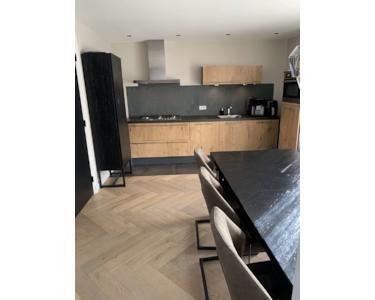 Bruynzeel keuken met vaatwasser, combi oven, koelkast, groot gasstel met afzuigkap.