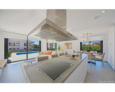 Die Doppelhaushälften der Anlage verfügen über drei Schlafzimmer und drei bis vier Badezimmer, eines als Bad en suite. Davon befindet sich ein Schlafzimmer und ein Badezimmer im Erdgeschoss. Im Obergeschoss befindet sich der Master-Bedroom mit Zugang zu privaten Terrasse. Das Zentrum der Wohnung bildet der großzügige Wohnbereich mit angrenzender offener Küche inklusive hochwertiger Einbauküche. Der Wohnbereich bietet einen direkten Zugang auf die große Terrasse und den angrenzenden privaten Garten. Der Garten bietet eine Fläche zwischen 180 qm und knapp 360 qm.