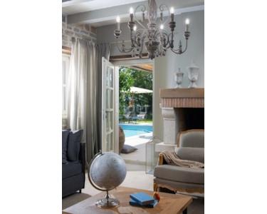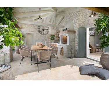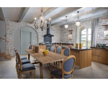 Im Erdgeschoss der Villa gibt es eine Küche, ein Esszimmer, ein Badezimmer, ein Wohnzimmer mit Außen- und Innenkamin,