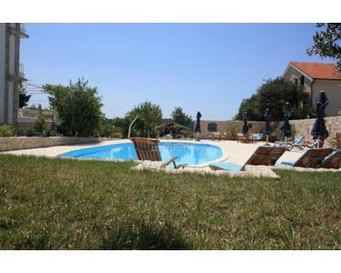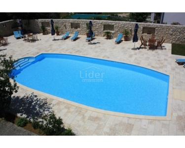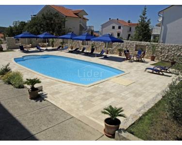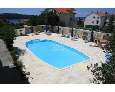 Das Haus besteht aus einem Erdgeschoss und zwei Etagen mit mehreren Wohnungen und der Möglichkeit, ein Restaurant im Erdgeschoss zu eröffnen. Auf einem großen und gut gestalteten 1.788 m2 großen Garten befindet sich neben dem Haus ein großer 12x6 m großes Schwimmbad mit automatischer Dosierung und Elektrolyse. Das Schwimmbad hat auch eine Außendusche, eine Toilette, einen Grill und einen wunderschön gefliesten Bereich um ihn herum. Der Garten hat auch seinen grünen Teil, Olivenhain sowie Obstbäume und andere einheimische Pflanzen, die mit Hilfe von Hydrophoren mit Regenwasser bewässert werden. Es gibt auch einen Parkplatz, der den Bedürfnissen des Hauses entspricht. Das Haus verfügt über eine Garage sowie eine Waschküche. Es sollte betont werden, dass das Haus über eine eigene Solarheizung sowie eine Zentralheizung verfügt und jede Wohnung klimatisiert ist. Die Lage des Hauses ist angesichts der Nähe zum Meer und zur Promenade äußerst gut, und das Haus selbst erfüllt alle Anforderungen des modernen Tourismus.