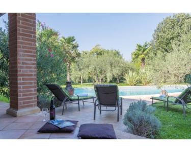 Neben Palmen und Zierpflanzen gibt es auch einen Swimmingpool sowie einen Erholungs- oder Entspannungsbereich im angelegten Garten.