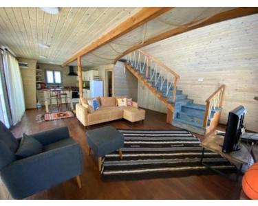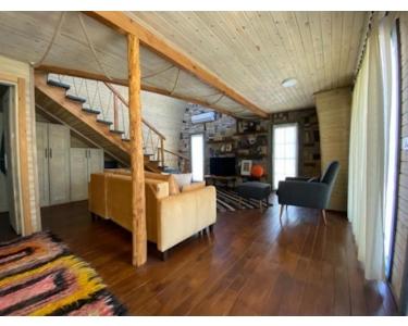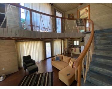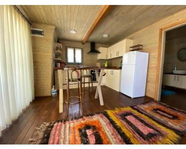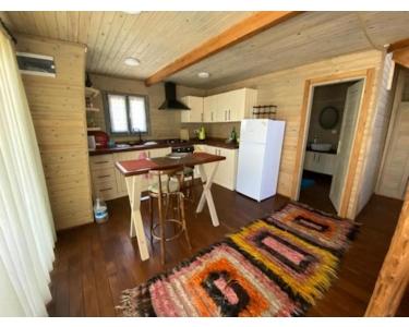 Dazu das Holzhaus, ein Zimmer, ein Wohnzimmer, Küche, Bad und WC. 65 Quadratmeter.
