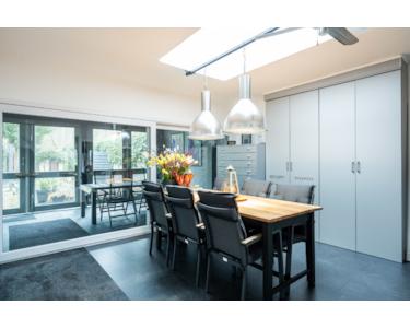 Wintergarten (4,79 x 4,13 m) mit Schiebetüren, Laminatboden und Dachkuppel.