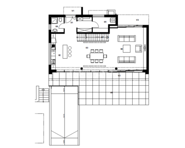Im Erdgeschoss gibt es eine Waschküche, ein Badezimmer, eine Küche, ein Esszimmer und ein Wohnzimmer mit einem wunderschönen Blick auf das Meer durch große Glaswände.