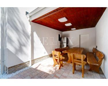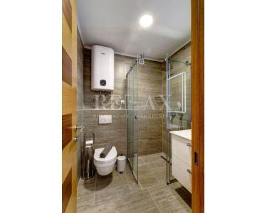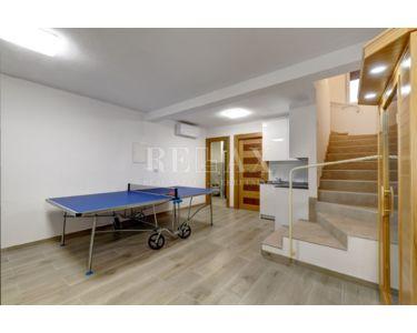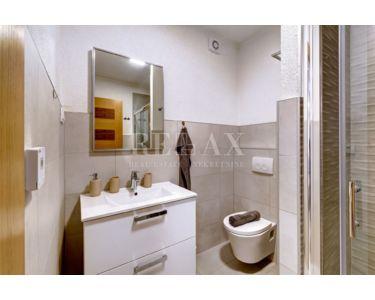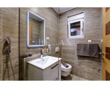 Im Erdgeschoss des Hauses gibt es ein Schlafzimmer mit eigenem Bad, eine Toilette, eine offene Küche mit Wohnzimmer und einen Ausgang zu einer überdachten Terrasse, vor der sich ein Swimmingpool mit Liegewiese und schöner Aussicht befindet auf das Meer und die Insel Krk.