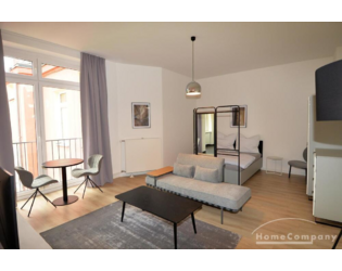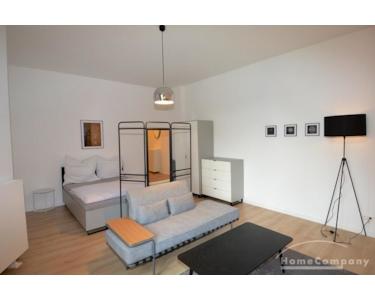 Schöne 1-Zimmer-Wohnung in Berlin Mitte. Das Apartment ist mit einem Doppelbett , Fernseher, einer Stehlampe, Schreibtisch und einem großen Fenster ausgestattet. Das Badezimmer verfügt über eine Dusche und ein WC.