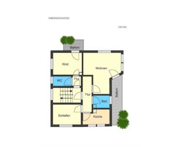 Das Obergeschoss mit nahezu identischem Grundriss besteht aus weiteren drei Zimmern, einer Küche, einem Tageslichtbad, einem Gäste-WC sowie zwei Balkonen und umfasst ebenfalls ca. 90 m² Wohnfläche.