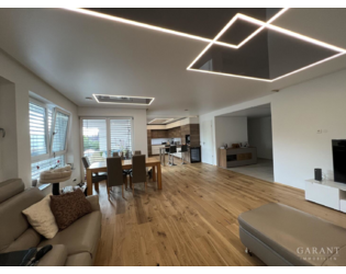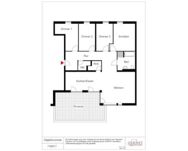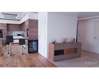 In dieser großzügigen Wohnung hat die ganze Familie Platz um sich zu entfalten. Über die Eingangstür kommen Sie in einen breiten Flur zu den 4 Schlafzimmern. Das separate Gäste-WC mit Dusche ergänzt das große, moderne Hauptbad. Bei mehreren Familienmitgliedern ist ein zweites Bad für alle ein Segen. Der Flur, modern gefliest, geht über in den großen Wohn-/Essbereich mit neuwertiger, wunderschöner Einbauküche mit Theke und hochwertigen Elektrogeräten. Neben der Gefrier-/Kühlkombination gibt es noch einen Kühlschrank für Getränke. Die Kaffeemaschine ist in die Küche integriert - sehr außergewöhnlich und praktisch. Daneben haben Sie einen Hauswirtschaftsraum mit Anschluss für Waschmaschine und Trockner sowie Vorräte oder andere wichtige Dinge für den Haushalt. Hier befindet sich auch die Umluftanlage für Ihre Wohnräume. Vom großen, hellen Wohn-/Essbereich, ausgelegt mit einem hochwertigen Parkettboden, schauen Sie ins "Grüne" oder können von hier aus auf Ihre über 30 qm große Terrasse gelangen. Hier kann man nach der Arbeit entspannen und mit der Familie oder Freunden den Tag ausklingen lassen. Ihre Wohneinheit hat ebenso elegante Spanndecken mit eingelassener, indirekte Beleuchtung (mit funkgesteuerten LED-Leuchten), ein Detail, das dieser Wohnung einen ganz besonderen Flair gibt.