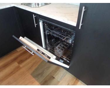 Schöne Eckküche mit Geschirrspüler und Kombi-Mikrowelle.