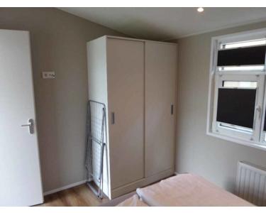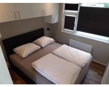 Schlafzimmer mit Doppelbett, Kleiderschrank und Drehkippfenster.