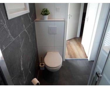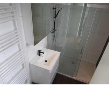 Schönes geräumiges Badezimmer mit Dusche, Waschbecken, Toilette und Design-Heizkörper.