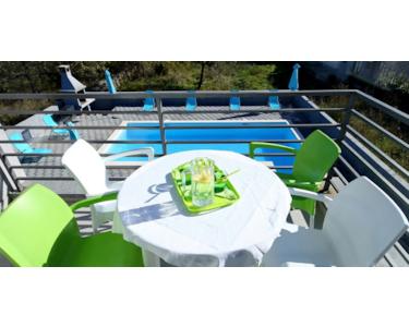Im Erdgeschoss befinden sich zwei Apartments. Das erste Apartment besteht aus Küche, Esszimmer, Wohnzimmer, zwei Schlafzimmern, Badezimmer, WC und Terrasse. Das zweite Apartment besteht aus einer Küche mit Essbereich, Wohnzimmer, einem Schlafzimmer, Badezimmer und Terrasse.