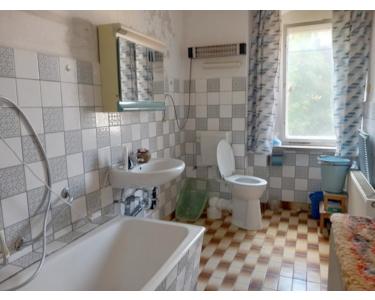 1. OG. : Flur; Bad mit Fenster; Wanne WC u. Waschbecken Küche; 3 Zimmer