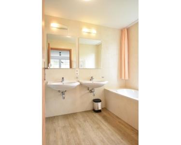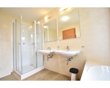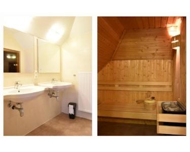 Bad 2 ist ein Luxusbad mit einer echten finnischen Sauna. Außerdem hat dieses Badezimmer 2 Waschbecken und eine Dusche.