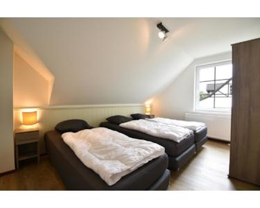 Das letzte Schlafzimmer hat 3 Boxspringbetten und einen Kleiderschrank.