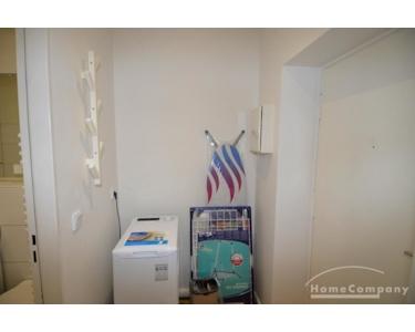 Ein-Zimmer-Wohnung in Mitte. Vollständig möbliert mit Bett, Tisch und Waschmaschine. Modern gefliestes Badezimmer mit Dusche. Im Flur befindet sich der Kleiderschrank.