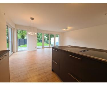 Vom großzügig gehaltenen offenen Wohn-Ess- und Küchenbereich, insgesamt ca. 48 bis 49 m² groß, gelangt man ebenerdig auf eine ca. 25 m² große Terrasse mit ebenerdigem Zugang zum Gartenbereich, der mit einem Stabmattenzaun eingefriedet ist.