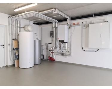 die Heizung ist im EG sowie im OG als Fußbodenheizung ausgelegt, die Wärmeverteilung im Studioraum des DG erfolgt über Heizkörper.