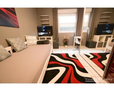 - ein Büro mit einem ausklappbaren Bettsofa, Kleiderschrank und einem Schreibtisch