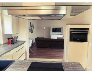 Über den gefliesten Windfang betreten Sie das „Herz“ der Wohnung, die zentrale Diele, die mit der offenen Küche, Bartisch und 4 passenden Barhockern ausgestattet ist. Die Küche verfügt weiterhin über Spülmaschine, Kühlschrank und Backofen.