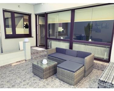 Eine große bodentiefe Fensterfront mit Tür bietet den Zugang in das Atrium auf die Terrasse, die mit modernen Loungemöbeln ausgestattet ist und, weil innenliegend und zum Teil überdacht, vor fremden Blicken schützt: ein idealer Ort, um an sonnenreichen Tagen zu entspannen!